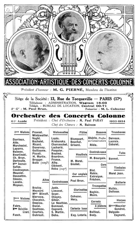 En 1928, il cède la baguette de Lamoureux à Albert Wolff, et partage pendant douze années une intense activité à la tête des orchestres de l'Opéra de Monte-Carlo (de 1928 à 1934), du Casino de Vichy (en été) et des Concerts Colonne, où il succède à Gabriel Pierné en 1932. Avec cette prestigieuse formation, il explore un vaste répertoire classique et romantique, mais inscrit régulièrement à ses programmes les œuvres nouvelles de compositeurs tels que Eugène Bozza, Jacques de la Presle, Yvonne Desportes, Edmond Marc, Elsa Barraine, Henry Barraud, Francis Poulenc, Maurice Duruflé… ou Serge Prokofiev, alors exilé en France. C'est aussi l'époque où Paul Paray, omniprésent sur les scènes parisiennes, conduit plusieurs cycles Wagner, tantôt avec Colonne, tantôt avec l'orchestre de l'Opéra de Paris, dont il est premier chef.